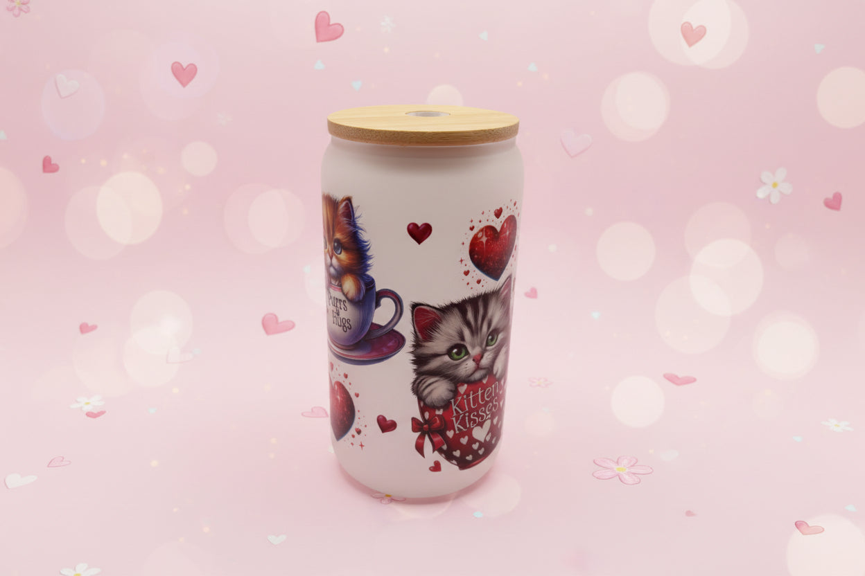 Celebrate love with our charming 16 oz glass cup, the perfect vessel for your favorite beverages. Featuring adorable cat designs ideal for Valentine's Day, this durable glassware combines functionality with whimsical feline charm. Whether you're sipping morning coffee or an evening tea, this thoughtfully crafted cup brings warmth and personality to your daily routine. A delightful gift for cat lovers and romance enthusiasts alike.